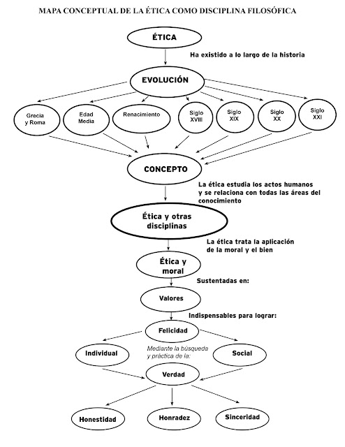 La ética como disciplina filosófica es una ciencia que se ha venido desarrollando desde el siglo VI a.C. En el siguiente mapa conceptual podemos ver como es que se relaciona con diversos conceptos, entre ellos la moral y la felicidad como fin último de la actividad ética del ser humano.